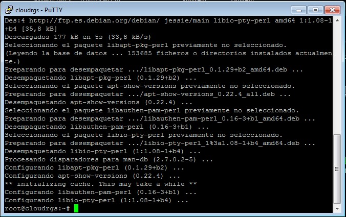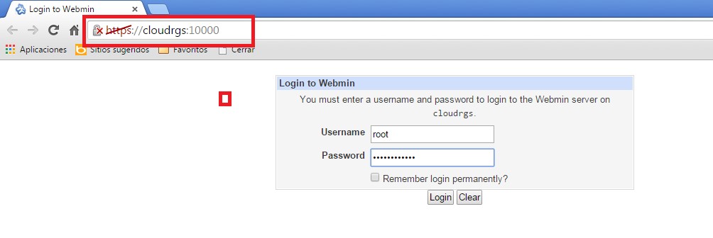 - Una vez que la instalación se ha realizado correctamente podremos acceder a la gestión del servidor a través de la URL que nos indica, https://cloudrgs:10000/ :