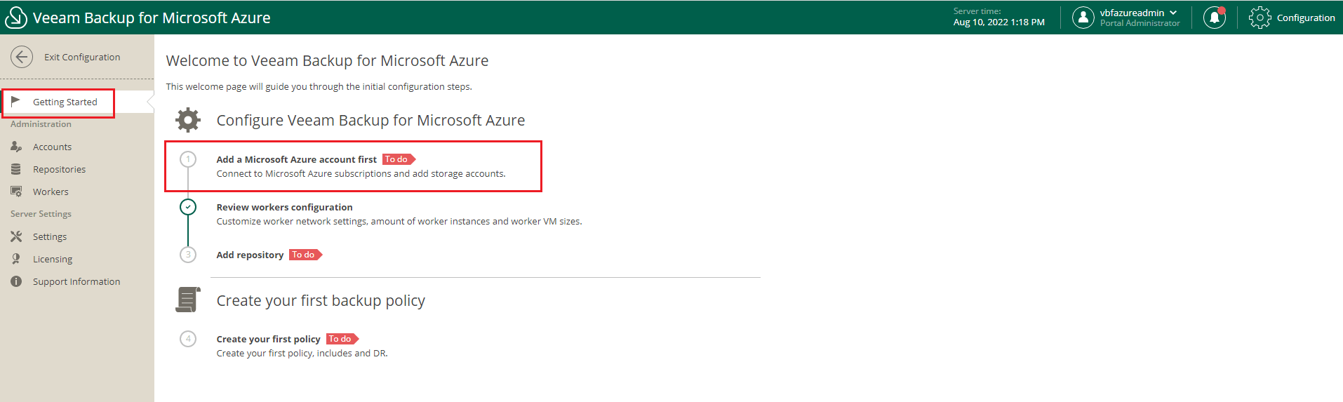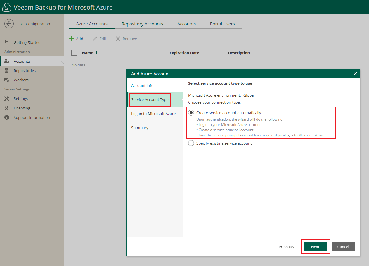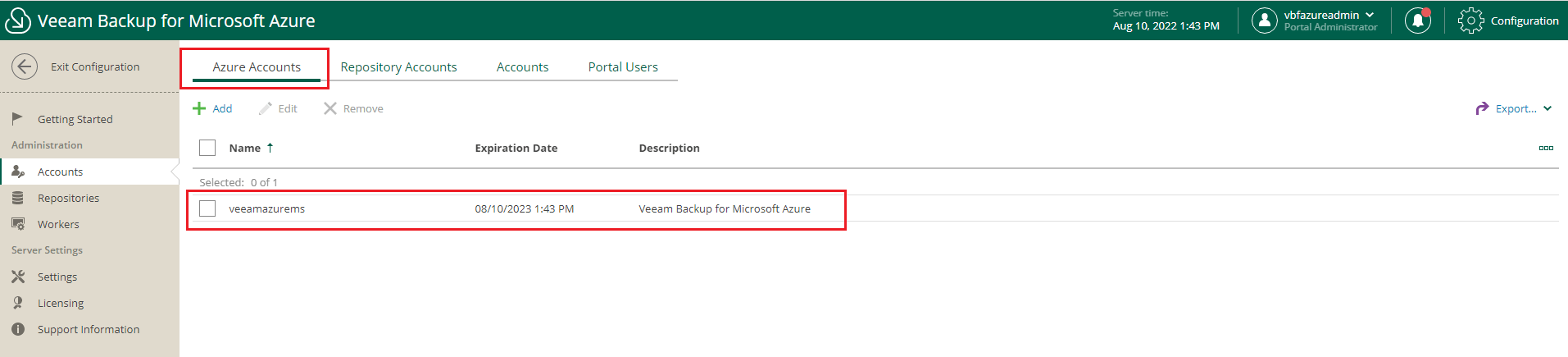 - Sobre Configuration > Accounts podemos configurar las distintas cuentas que usaremos en nuestro Veeam Backup for Microsoft Azure: