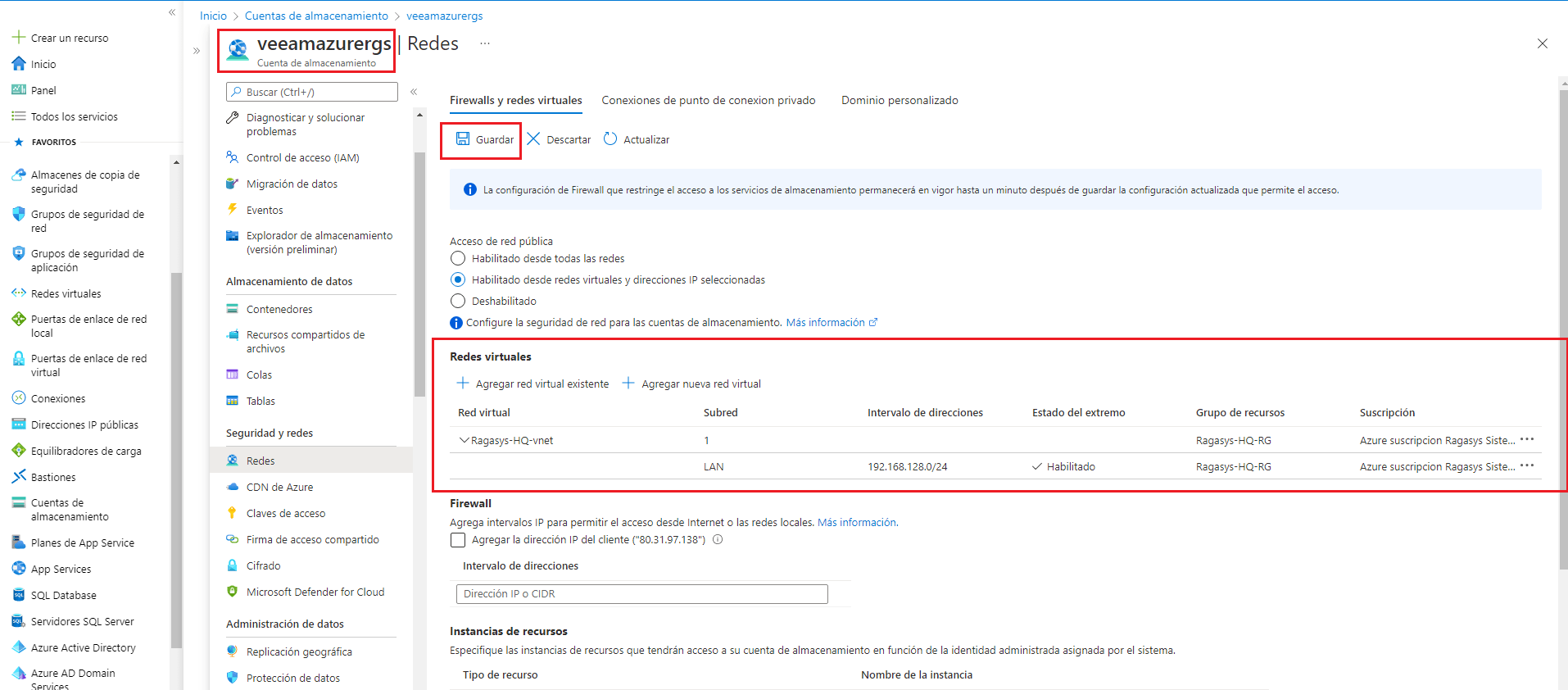 - Entonces, sobre el portal de Azure, accedemos a Cuentas de almacenamiento y sobre la cuenta que nos creamos anteriormente agregamos y habilitamos la Red virtual y la subred correspondiente a los workers:
