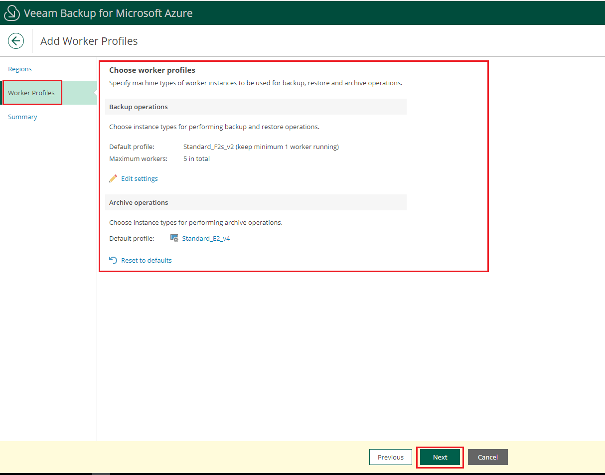 - Sobre Worker Profiles, seleccionamos los perfiles de Backup operations y Archive operations, siguiente:
