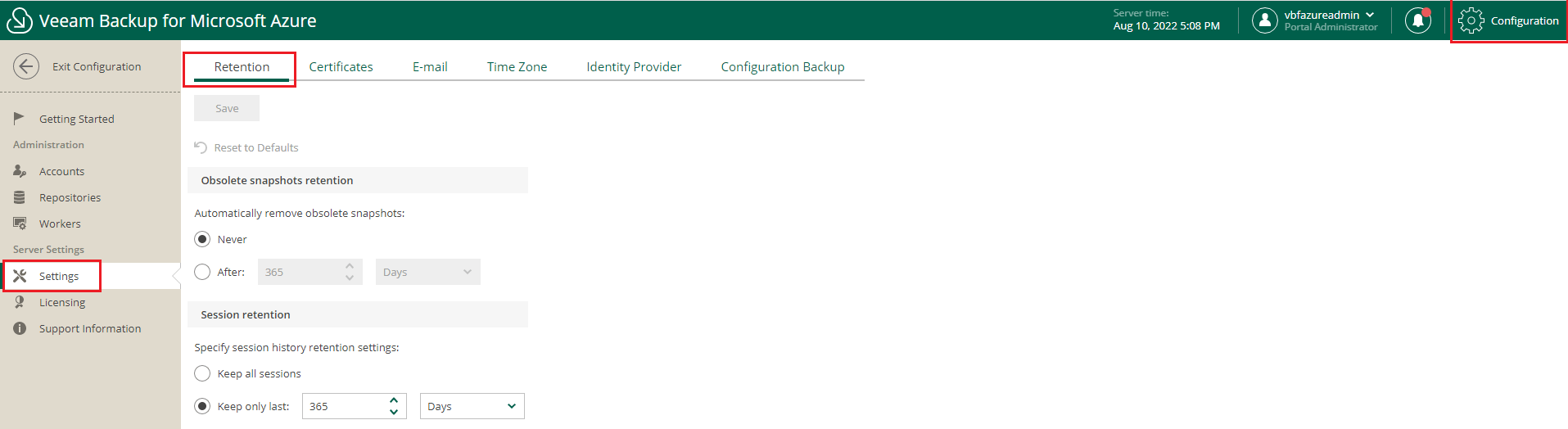 - Configuration Backup, donde vamos a programar los backups de la propia configuración que tengamos realizada en nuestro Veeam Backup for Microsoft Azure: