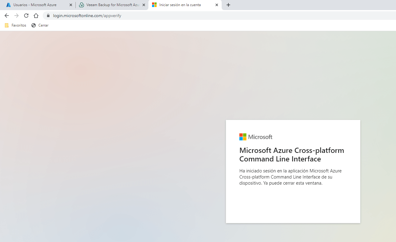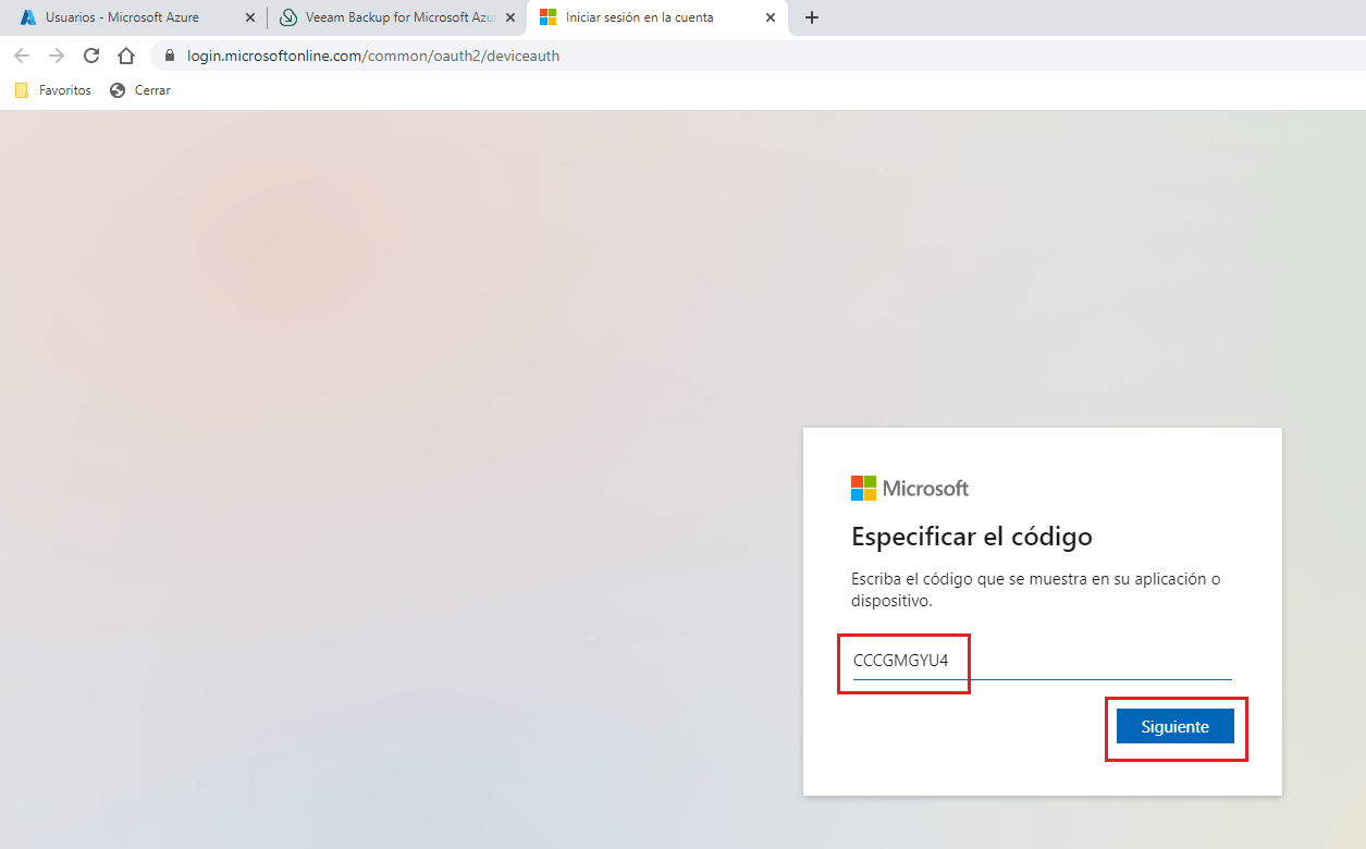 - Sobre Logon to Microsoft Azure accedemos a la URL indicada, para así dar permisos sobre la instancia de Veeam Backup for Microsoft Azure, utilizando el código indicado: