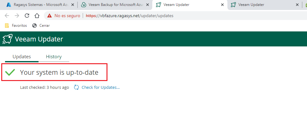- Sobre Configuration > Support information > Updates > Checks and View Updates podemos actualizar Veeam Backup for Microsoft Azure y todos sus componentes, en nuestro caso lo tenemos todo actualizado: